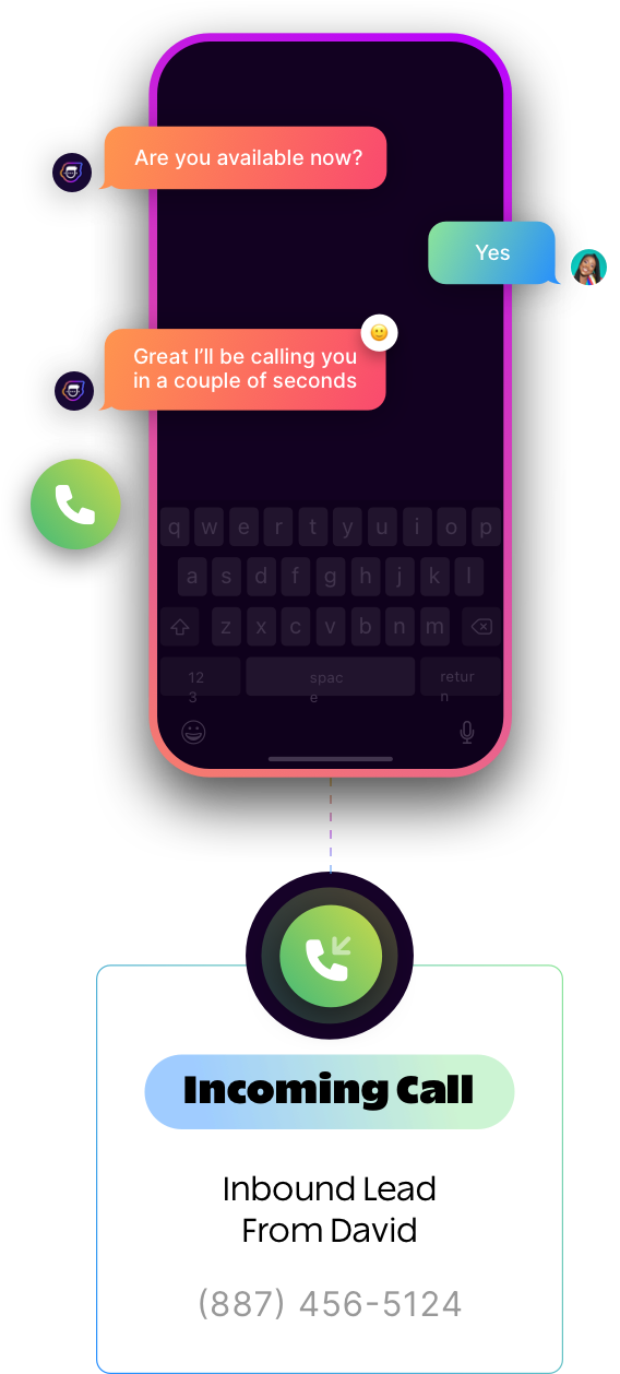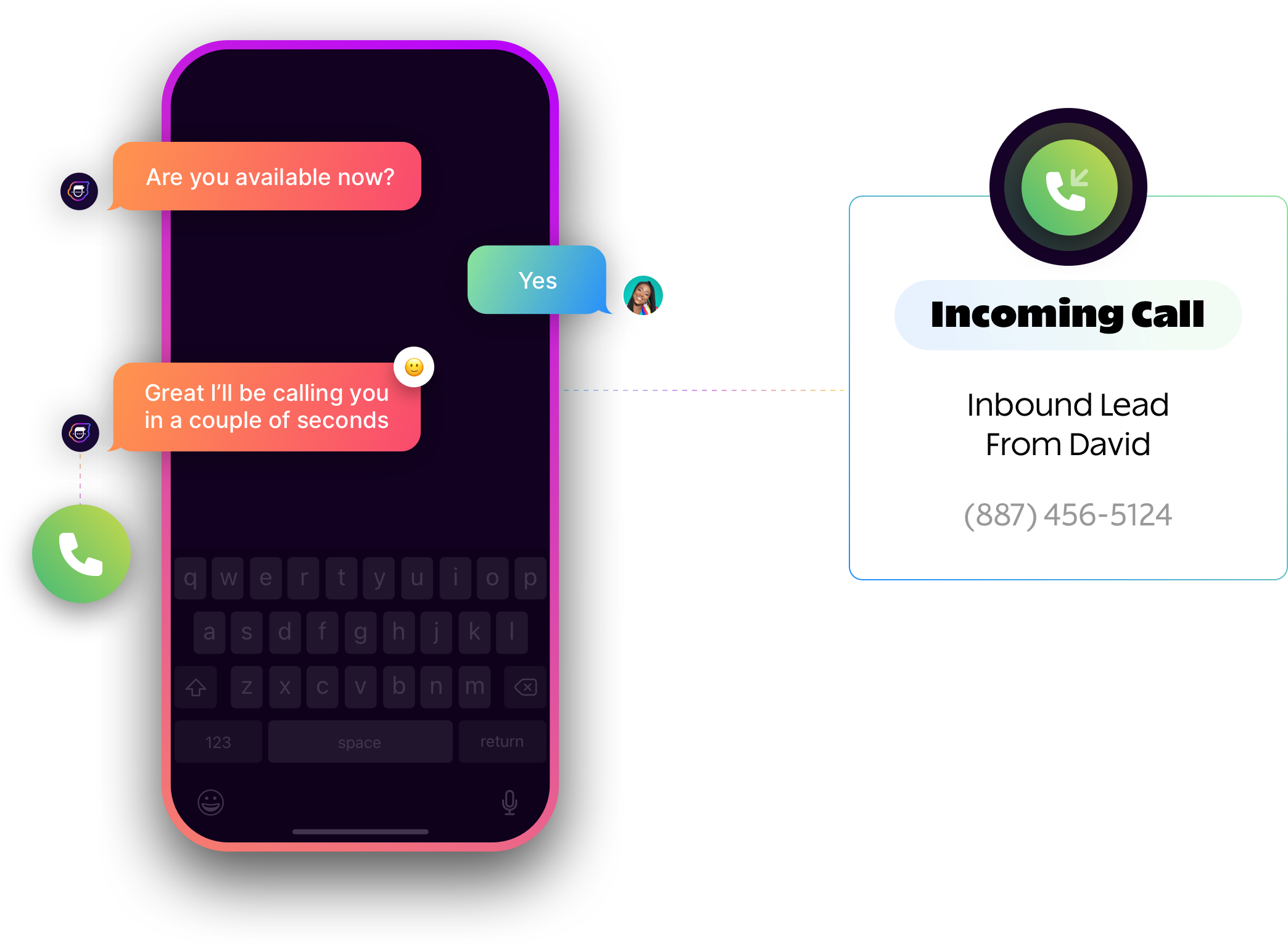 Once a lead becomes qualified, they have the ability to initiate a phone call directly from a text message. Mav will call the lead from the same phone number they've been texting with, while simultaneously calling an available sales rep and letting them know a lead is on the line and ready to take the next step. Once both parties have confirmed availability, Mav joins the calls and the sales rep can step in to close the deal. If either are not available, Mav will immediately text the lead and find the next best time for a call, while continuously updating statuses in the CRM.